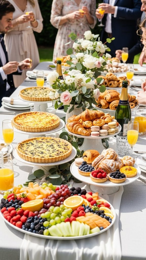 A mid-morning brunch is both casual and chic, making it a popular choice for bridal showers. Offer a mix of breakfast and lunch items, such as pastries, quiches, fruit platters, and mimosas. Decorate tables with fresh flowers, soft linens, and personalized napkins to add a festive touch. Brunches are versatile and allow for activities such as games, gift openings, or crafting sessions without feeling rushed.