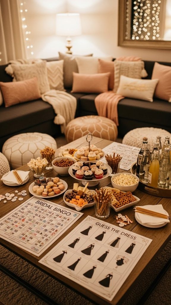 Games are a great way to break the ice and keep guests entertained. Organize a bridal game night featuring classic games like “Bridal Bingo,” “How Well Do You Know the Bride?” or “Guess the Dress.” Set up a cozy game area with comfortable seating, decorative pillows, and snacks. Offering small prizes for winners adds an element of excitement. A game night ensures laughter, bonding, and plenty of memorable moments.