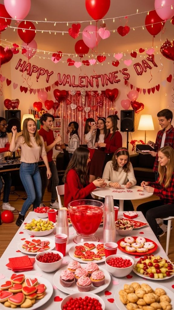 End the event with a fun, inclusive celebration. Decorate the space with hearts, positive quotes, and warm colors. Include snacks, music, and casual games. Focus on creating a welcoming atmosphere where everyone feels included, regardless of relationship status.