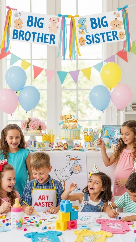 Make the older children feel special by centering the theme around siblings. Decorations can highlight “Big Brother” or “Big Sister” roles, and activities can include sibling art projects or story-sharing moments. This idea helps children feel included and excited about the new addition, strengthening family bonds.