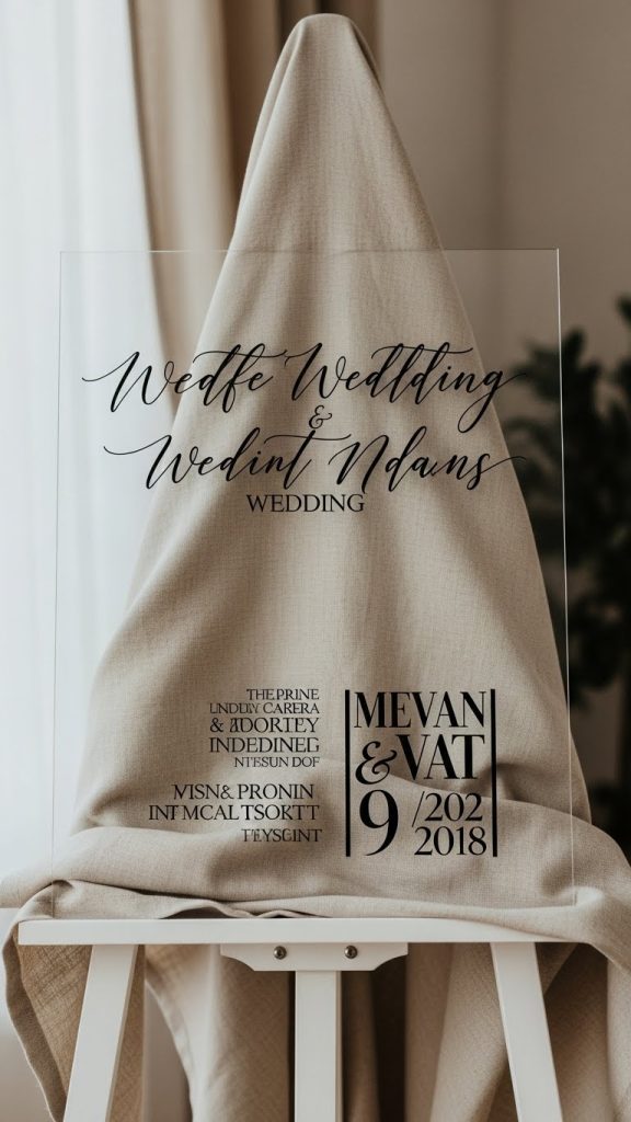 Minimalist wedding signage often features clean fonts, ample spacing, and neutral backgrounds. Acrylic signs, linen signage, or simple paper prints with black or gray typography feel modern and elegant. Whether it’s a welcome sign, seating chart, or menu display, minimalist typography ensures clarity while contributing to the overall design harmony.
