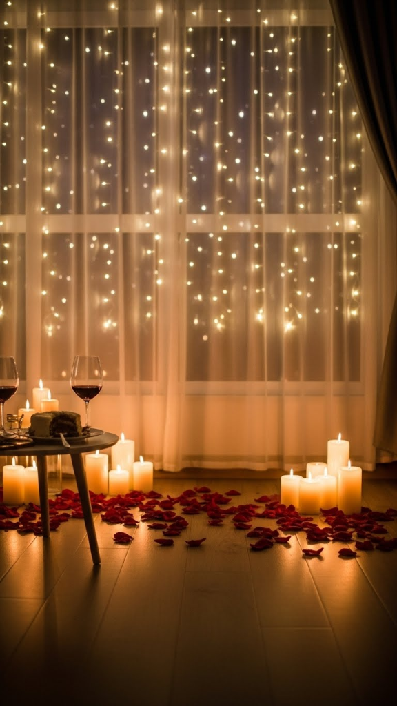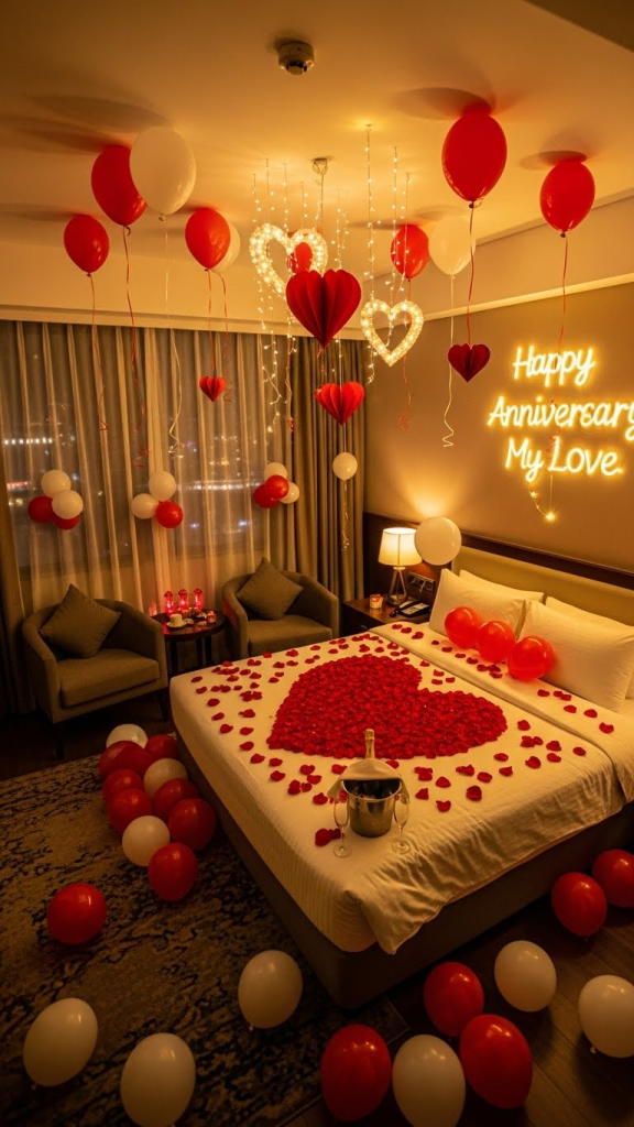Bring hotel-style luxury into your home by focusing on textures and layers. Use satin or velvet fabrics, warm lighting, elegant candles, and premium décor items. Add a decorated cake table, champagne glasses, and soft background music. This idea makes your home feel like a romantic getaway without stepping outside.