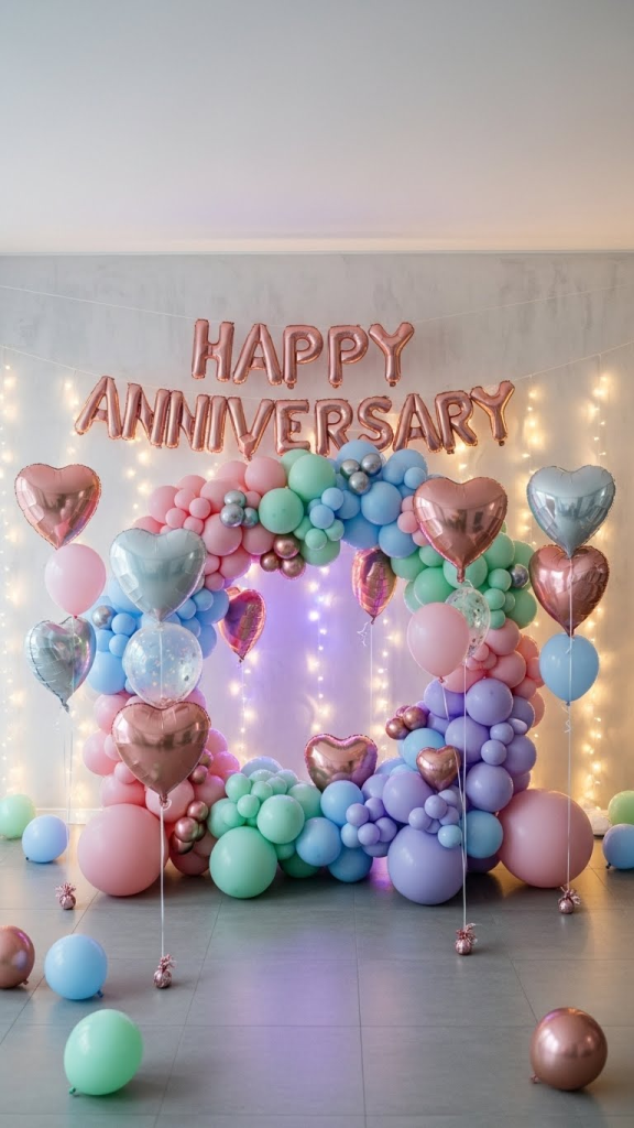 Balloons are classic, but you can elevate them with modern styling. Use metallic balloons, heart-shaped designs, or pastel color palettes. Create balloon arches, balloon walls, or ceiling balloon installations with hanging ribbons. Adding “Happy Anniversary” foil balloons or number balloons representing the years together makes the décor more personal and visually striking.