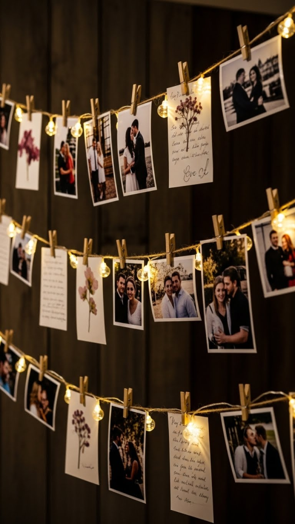 Celebrate your journey together by showcasing memories. Create a photo wall or photo string display with pictures from your wedding day to recent moments. Add fairy lights, wooden clips, and handwritten notes or dates under each photo. This idea not only decorates the space but also adds emotional depth to the celebration.