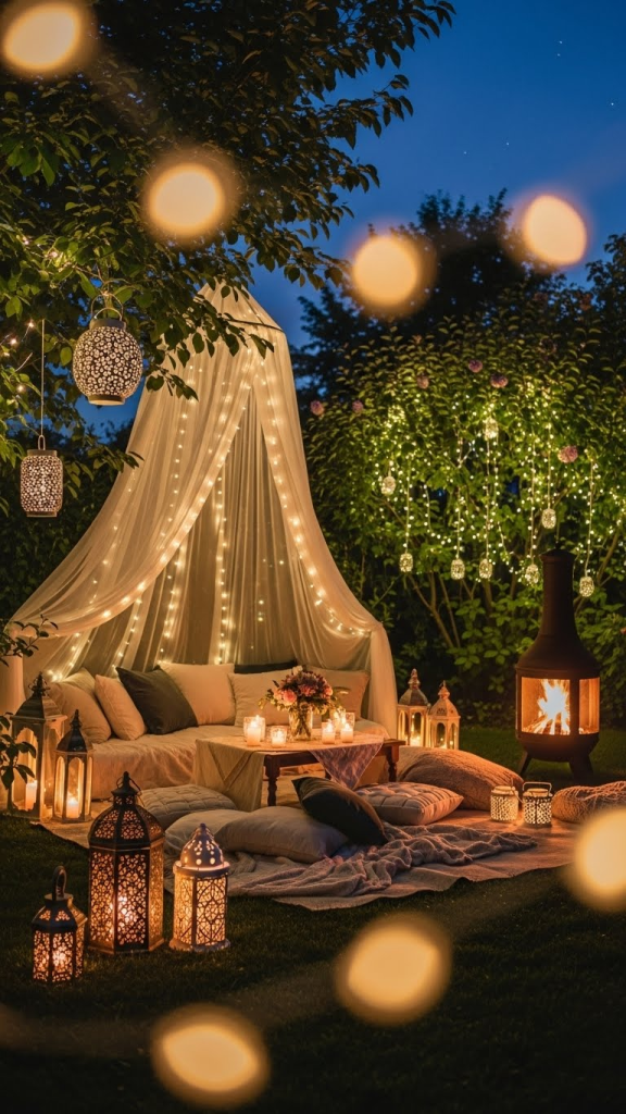 For those who love open-air celebrations, a backyard or rooftop setup can be magical. Decorate with string lights, lanterns, soft cushions, and low seating. You can add a small canopy or tent with drapes for a cozy feel. This idea works wonderfully for evening celebrations with music and light refreshments.