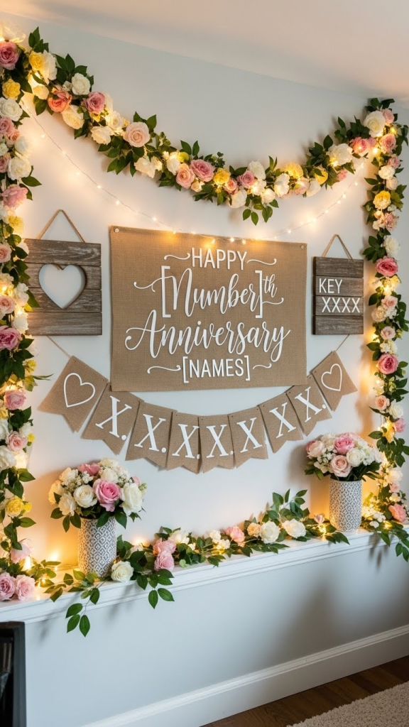 Personalized banners and signage are a fun and charming addition to your decor. Use banners that display messages like “Happy Anniversary,” “Years of Love,” or even your wedding date. Handmade options with calligraphy, glitter, or floral designs add an extra personal touch. You can place the banners above your dining table, living room wall, or balcony railing. Personalized signage reflects thoughtfulness and makes the celebration feel curated just for the two of you.