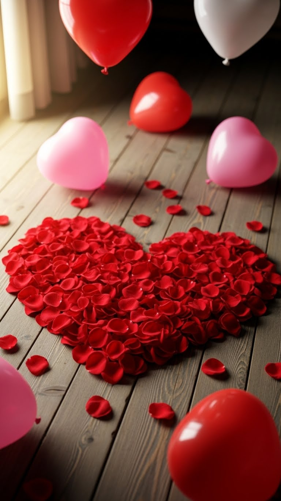 Heart-shaped decor is a simple yet impactful way to emphasize love. Use heart-shaped balloons, paper cutouts, or cushions strategically around the room. You can also create a heart-shaped arrangement using rose petals on the dining table or the bedroom floor. For an added touch, consider heart-shaped fairy light designs or a garland made of tiny hearts to frame a special corner of your home.