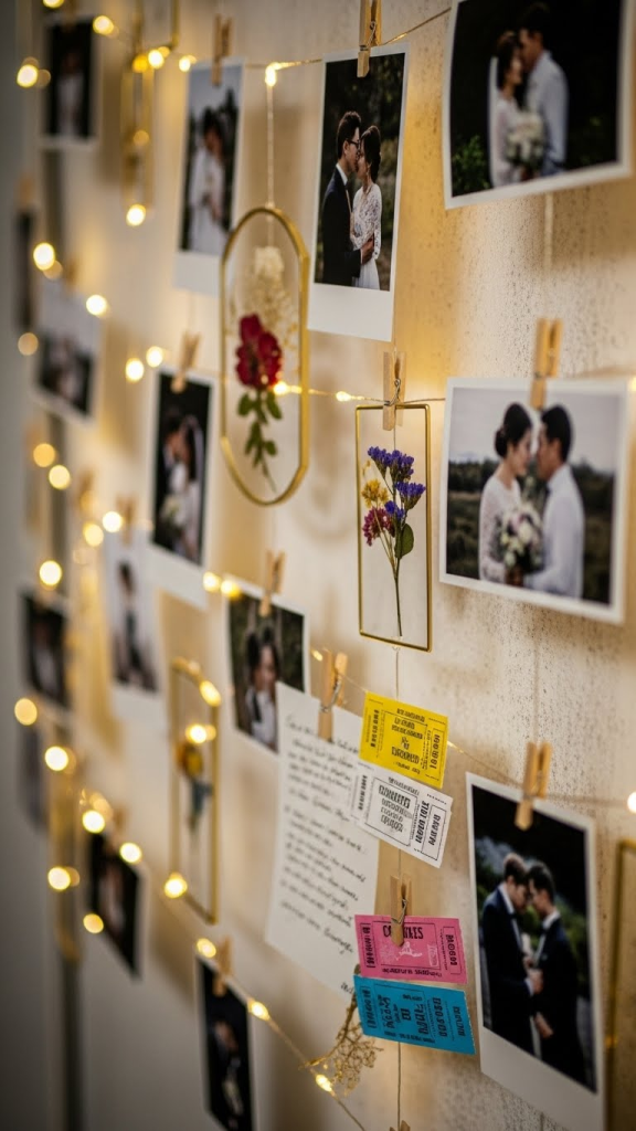 A memory wall is a heartfelt way to reflect on the journey you’ve shared. Gather photos from your wedding day, vacations, or significant moments together. Arrange them creatively on a wall using string lights, photo clips, or a corkboard. You can also add captions, quotes, or small mementos like ticket stubs and pressed flowers. This personalized decor not only enhances the aesthetic of your space but also brings nostalgia and warmth to your celebration.
