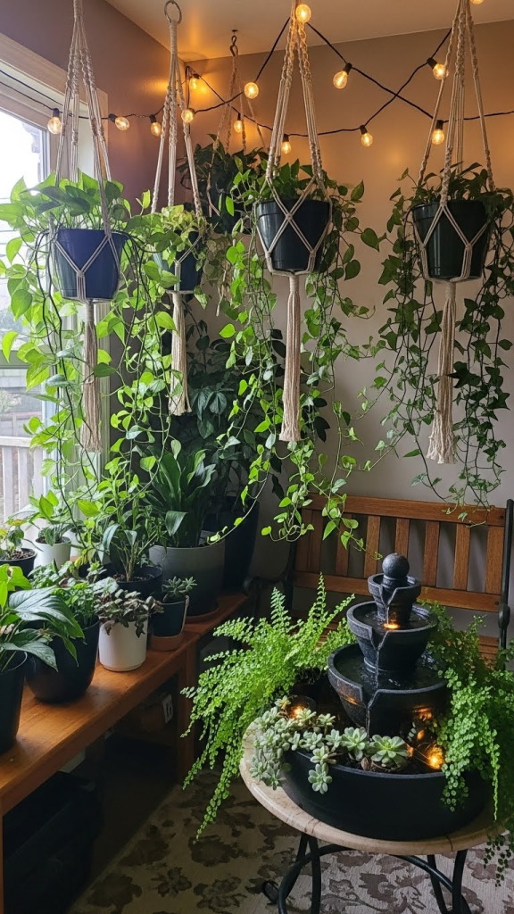 If you both love nature, an indoor garden theme can be enchanting. Decorate your living room or balcony with potted plants, hanging planters, and floral garlands. Use soft fabrics like green and cream table runners to complement the natural setting. A small water feature, like a tabletop fountain, can create a serene environment. Incorporating natural light or warm string lights will make the indoor garden feel even more inviting and romantic.