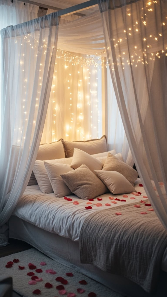 Creating a canopy of fairy lights over a bed or seating area is one of the easiest ways to bring instant romance. Drape the lights across the ceiling or around a curtain frame to form a glowing tent. Combine with sheer curtains or soft tulle for an ethereal look. You can also sprinkle petals on the bed or add small cushions to create a cozy space for you and your partner to relax, talk, and relive fond memories.