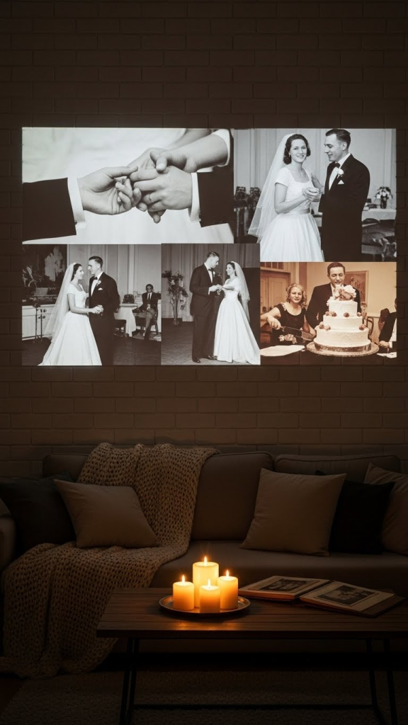 For a modern twist, project your favorite memories onto a wall or blank screen. Compile photos and videos from your wedding day, trips, or special occasions into a slideshow or video montage. Add romantic music to create a cinematic experience at home. This immersive decor idea not only transforms your living space but also evokes emotions, reminding you of the beautiful journey you’ve shared as a couple.