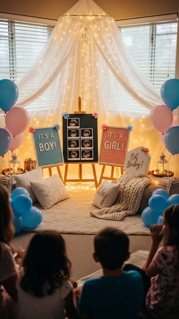Creating a personalized reveal corner makes the celebration feel extra special. Include ultrasound photos, baby name guesses, milestone boards, and framed quotes. Decorate the area with balloons, lights, and fabric to match your theme. This corner becomes an emotional highlight where guests can connect with the parents-to-be and take meaningful photos.
