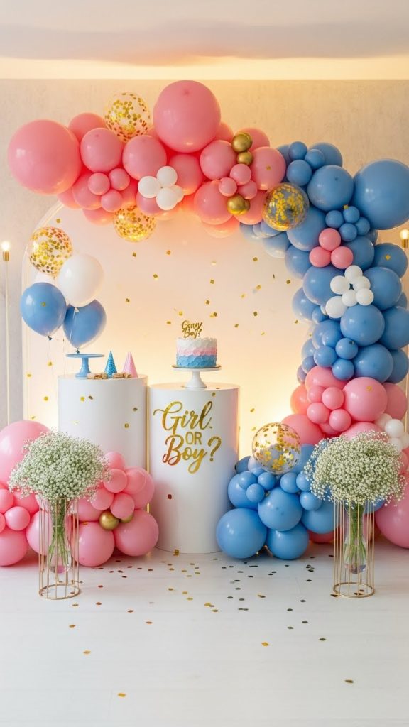 A pink and blue balloon arch is a timeless gender reveal decoration that never goes out of style. You can place it at the entrance, behind the dessert table, or as a photo backdrop. To keep the suspense alive, balance both colors evenly and add neutral tones like white, gold, or beige. Balloon arches instantly elevate the party atmosphere and look stunning in photographs, making them a favorite choice for many parents.