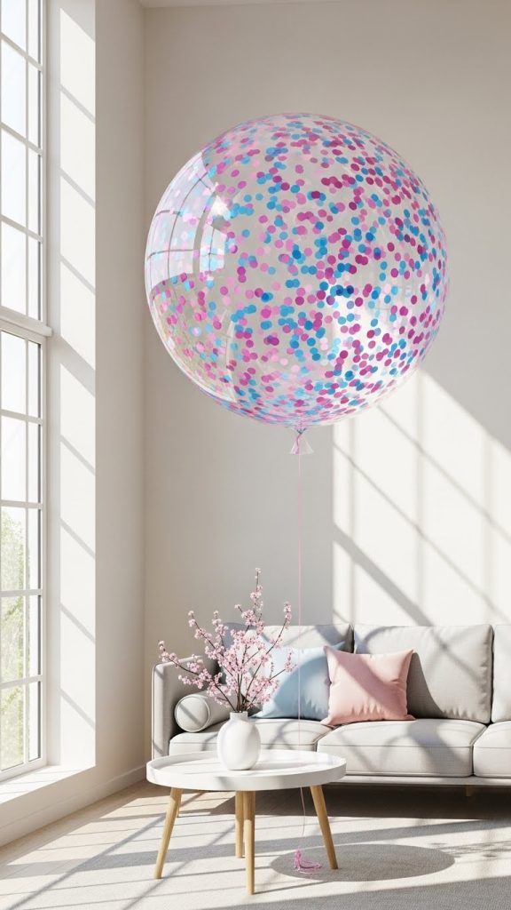 Confetti balloons add an element of surprise and fun to your décor. Large transparent balloons filled with pink or blue confetti can be popped during the big reveal moment. Until then, they look elegant and minimal, blending seamlessly with any party theme. You can hang them from the ceiling, place them in corners, or make them the centerpiece of the reveal countdown.