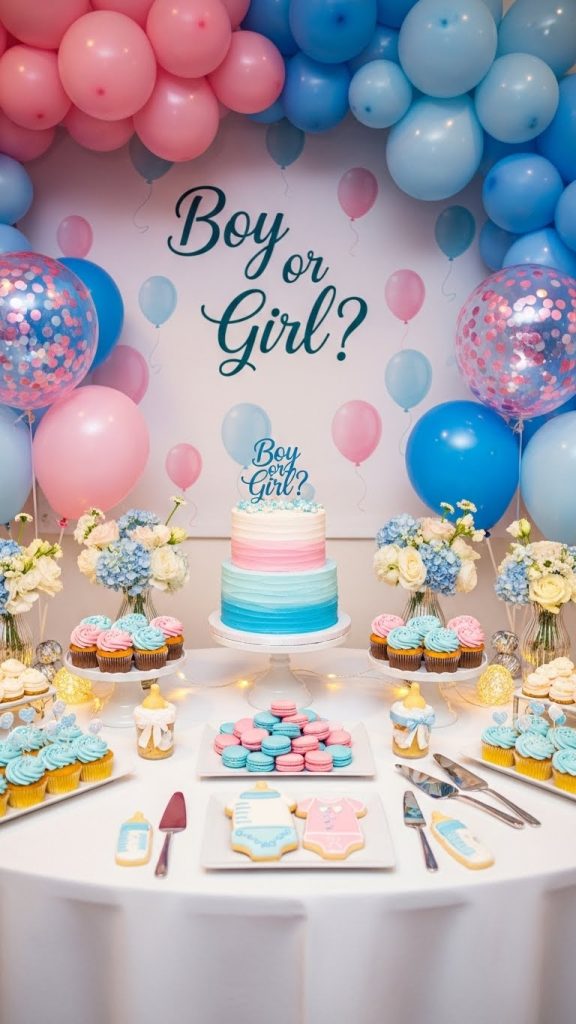 A dedicated dessert table is a focal point of any gender reveal party. Decorate the table with themed cake toppers, cupcakes with hidden colored fillings, and coordinated tableware. Use a backdrop with phrases like “Boy or Girl?” or “He or She?” combined with balloons, fabric drapes, or floral accents. A well-styled dessert table not only looks beautiful but also keeps guests gathered around for the big moment.
