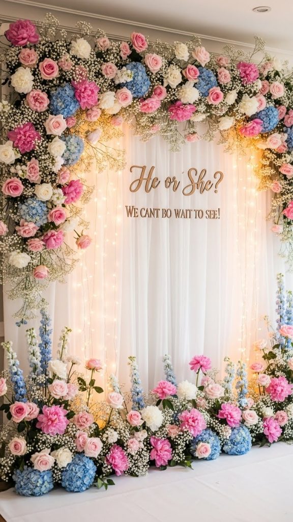 A floral backdrop adds elegance and charm to a gender reveal party. You can use artificial flowers in pink, blue, and white, or keep it neutral and let the reveal happen through another element. Floral walls are ideal for photo sessions and can be reused later for baby showers or nursery décor. Adding fairy lights or neon signs can give it a modern twist.