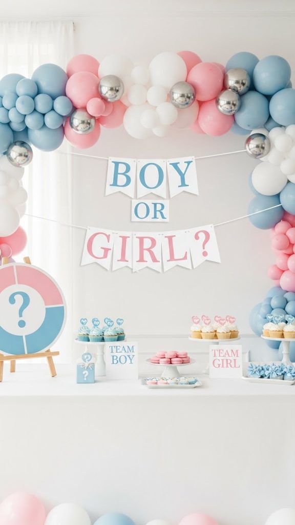 Sometimes simple decorations make the biggest impact. A bold “Boy or Girl?” banner paired with matching signage can set the tone of the entire party. You can place signs around the venue, on welcome tables, or near the reveal spot. Wooden boards, chalk signs, or acrylic lettering all work beautifully depending on your chosen theme.