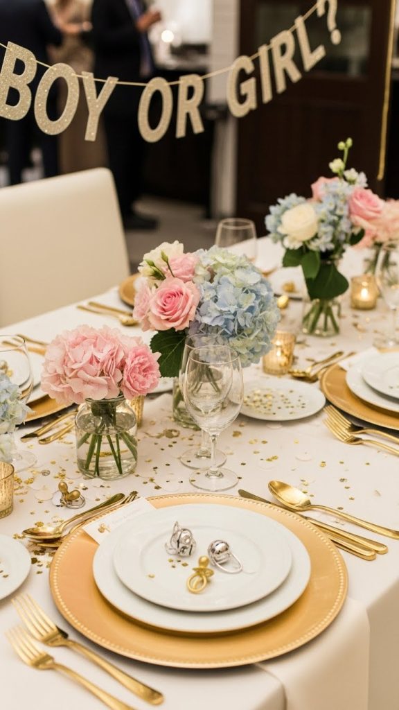 Table centerpieces are an often-overlooked detail that can tie the whole décor together. Use neutral vases filled with flowers, balloons, or ribbons that secretly hide pink or blue elements inside. When it’s time for the reveal, guests can open, pull, or pop the centerpiece to discover the gender together, making everyone feel involved.