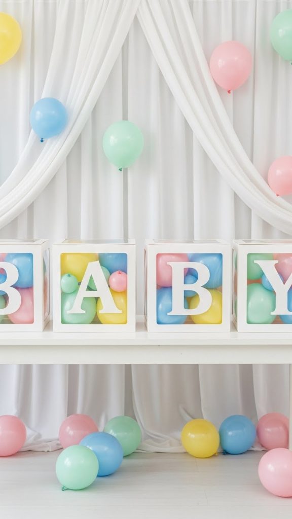 Transparent balloon boxes spelling words like “BABY,” “BOY,” or “GIRL” are trendy and Instagram-worthy. Before the reveal, the boxes can show neutral balloons or question marks. Once opened or rearranged, the colored balloons inside announce the gender. These boxes are easy to customize and add a modern touch to your décor.