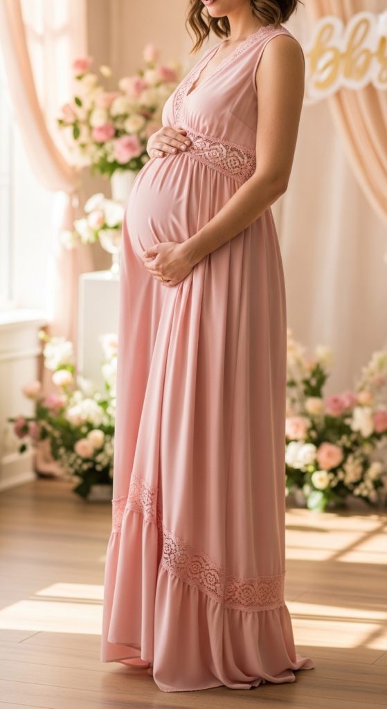 Pleated maternity dresses are a chic option that combines comfort with a polished appearance. The pleats add texture and movement, making the dress graceful and stylish. A light pink pleated dress with a cinched empire waistline highlights the bump beautifully while keeping the outfit breathable. This style works well with simple heels and delicate jewelry, making it versatile for both casual and semi-formal baby showers.