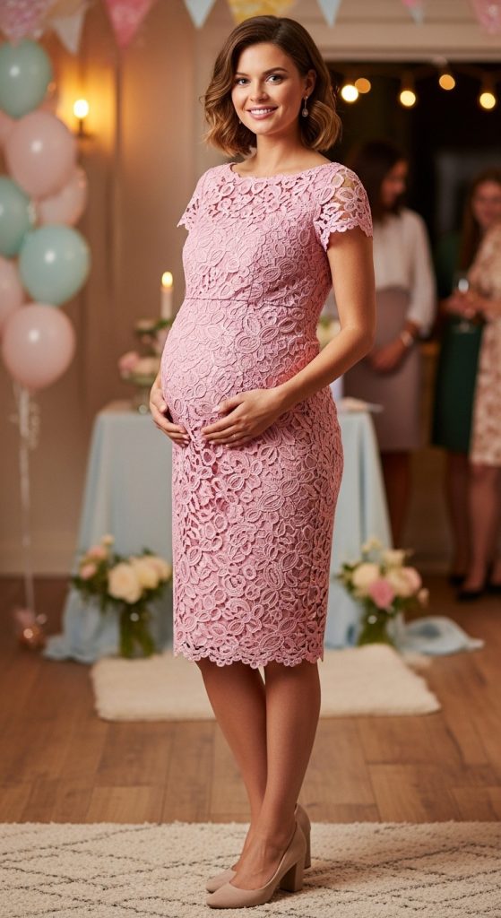 For moms seeking a more structured and elegant style, a lace sheath dress is an ideal pick. Lace adds texture and sophistication while hugging the body gently to highlight curves without being restrictive. Soft pink shades, from pastel to dusty rose, work beautifully for a baby shower. Pair this dress with a tailored blazer or a light shawl for cooler weather or a formal indoor setting.