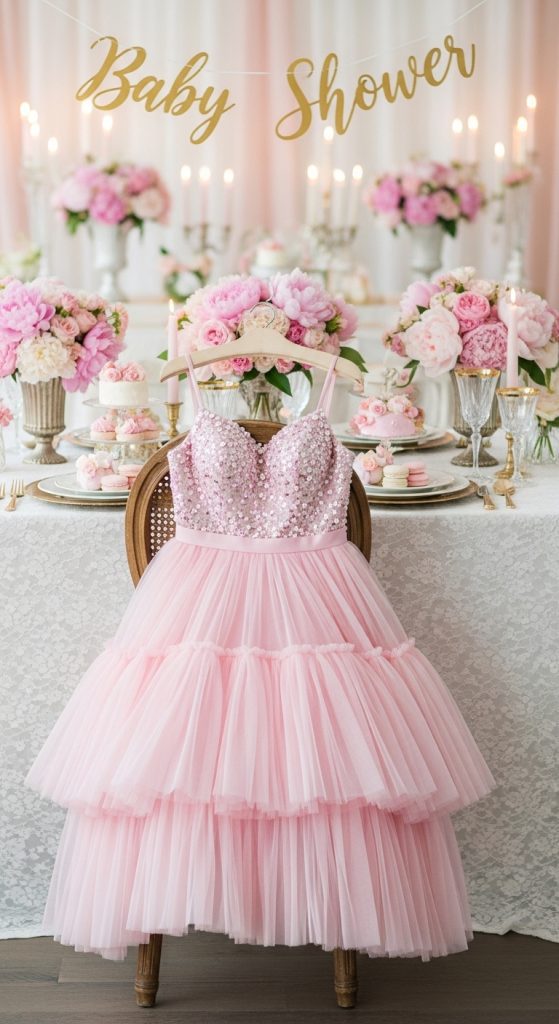 A tulle midi dress exudes a whimsical and fairy-tale charm, perfect for a celebration centered around joy and new beginnings. Look for designs with layered tulle skirts and a fitted bodice that accentuates the bump gracefully. Pink tones, especially blush or rose, make the dress soft and dreamy. Complement it with sparkly heels and a subtle hair accessory to complete a magical look.