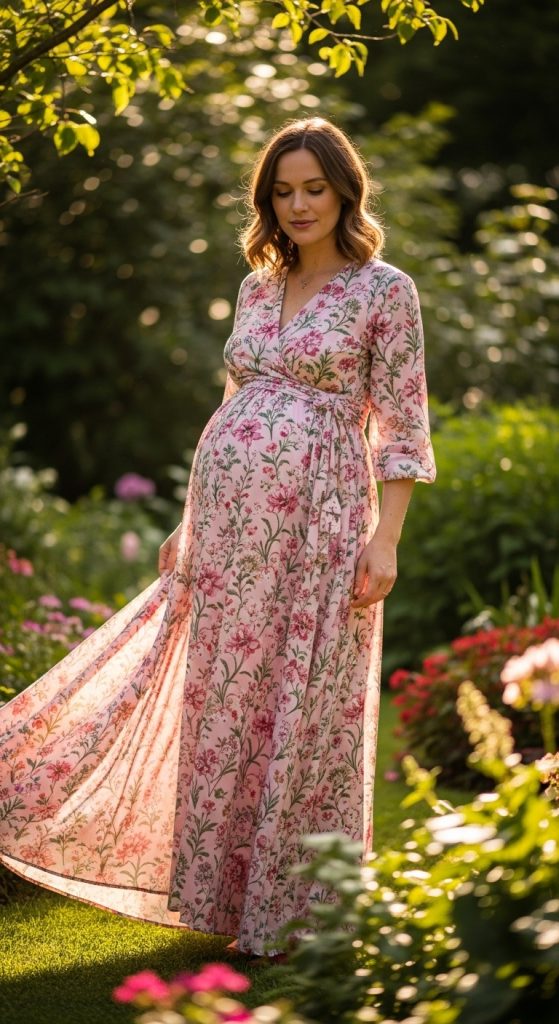 Floral prints add a fun, lively, and feminine touch to any maternity outfit. A pink dress with delicate floral patterns creates a soft and joyful aesthetic perfect for a baby shower. Choose fabrics that allow for movement and comfort, like chiffon or cotton blends. Pair the dress with simple nude heels or sandals and understated accessories to keep the focus on the playful pattern.