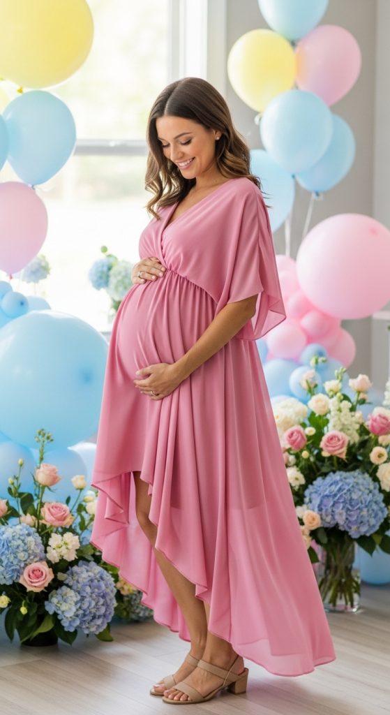 An asymmetrical hem dress adds a modern twist to traditional maternity attire. The varied lengths, often shorter in the front and longer in the back, allow the dress to flow elegantly around the bump while creating a dynamic and stylish look. Soft pink hues with subtle detailing such as lace or chiffon layers elevate the dress, making it ideal for a fashionable yet comfortable baby shower outfit.