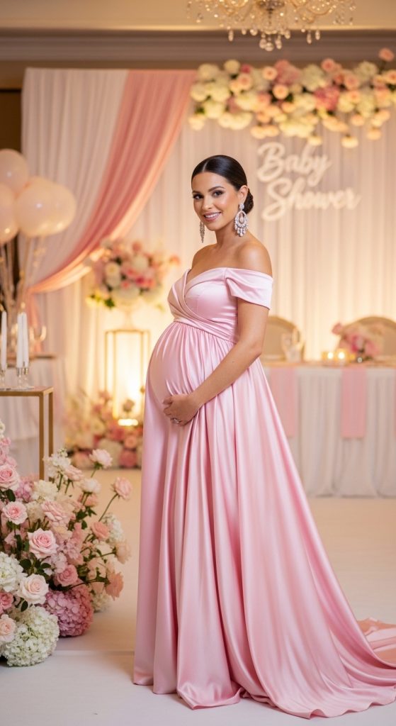 For moms who desire a more dramatic and glamorous appearance, an empire waist off-shoulder gown is a show-stopper. The combination of the high waistline and off-shoulder neckline ensures that the dress flatters the bump while emphasizing elegance. Choose gowns in pastel pink shades or blush satin for a sophisticated touch. Pair with statement earrings and soft curls for an unforgettable look.