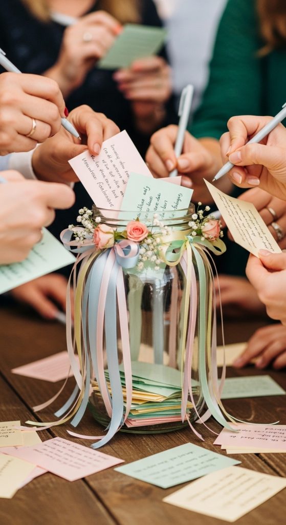 Engage your guests in a fun and sentimental activity with a DIY memory jar or wish box. Provide cards and pens for guests to write well-wishes, advice, or memories for the couple. Decorate the jar or box with ribbons, flowers, or personalized labels. This interactive decoration becomes a cherished keepsake long after the celebration, making your engagement party even more memorable.