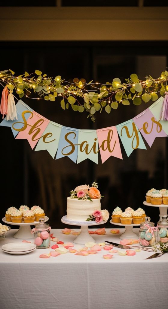 A beautifully crafted banner or garland is an instant statement piece for your engagement party. You can use cardstock, glitter, or even fabric to spell out the couple’s names or phrases like “She Said Yes” or “Engaged!” Adding small floral accents or fairy lights can enhance the elegance of your DIY creation. This decoration works perfectly over dessert tables, entryways, or even as a backdrop for photos.