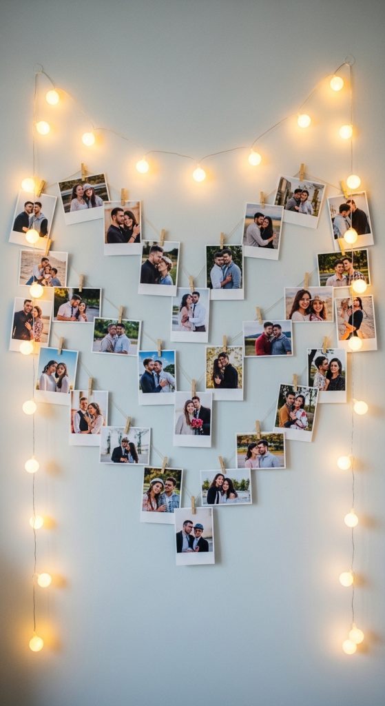 A photo wall is both decorative and meaningful, capturing memories of the couple’s journey together. Use string lights and mini clothespins to hang printed photos of the couple from their relationship milestones. You can also create a heart-shaped or circular arrangement to give the wall a more artistic, polished look. This not only adds charm but also provides a fun interactive element for guests.