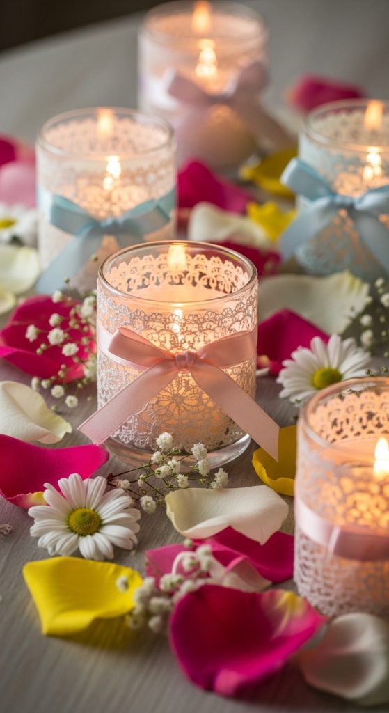 Candlelight sets the mood for an intimate engagement celebration. For a DIY touch, consider using glass votives, mason jars, or lanterns to hold tea lights or pillar candles. You can embellish them with ribbons, lace, or metallic paints. Scented candles not only look lovely but also enhance the ambiance, making your engagement party feel warm and inviting.