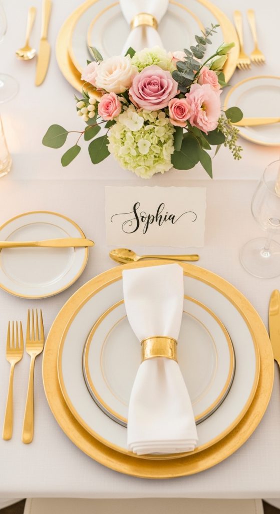 Personalized table settings show guests that every detail was thoughtfully considered. Create DIY place cards using cardstock or small wooden plaques, and add the guest’s name with calligraphy or metallic markers. You can also use small floral arrangements, candles, or themed trinkets to decorate each table setting, making the overall presentation feel cohesive and elegant.