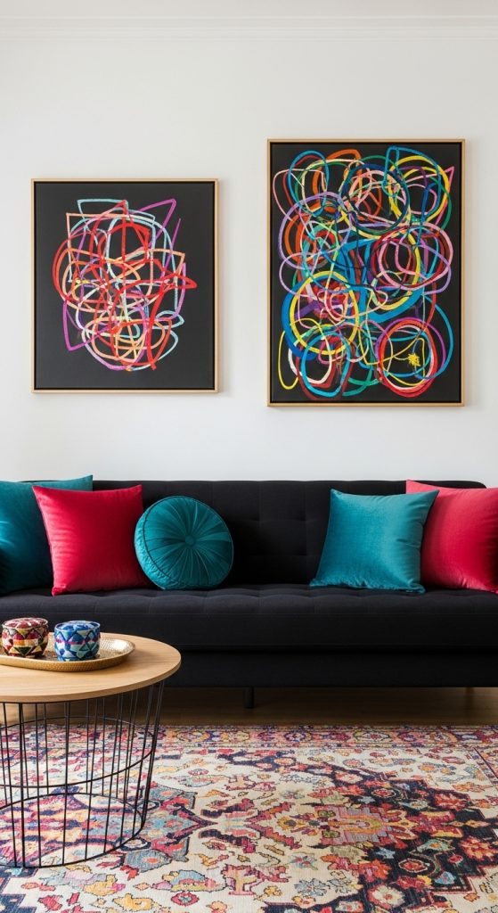 Black acts as a perfect backdrop for vibrant pops of color. Bright cushions, colorful rugs, or bold artwork can instantly lift the room. Think jewel tones like emerald green, sapphire blue, or ruby red for a rich, eye-catching contrast.