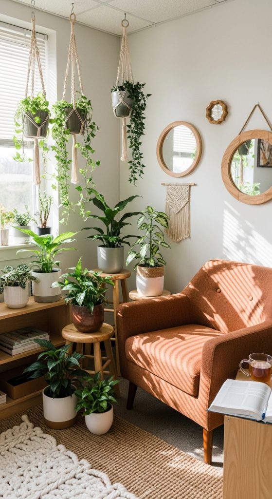 Bring the outdoors inside by creating a nature-inspired corner. Add potted plants, hanging planters, or even a small indoor herb garden. If natural plants are hard to maintain, high-quality faux plants work beautifully too.