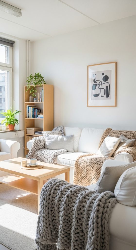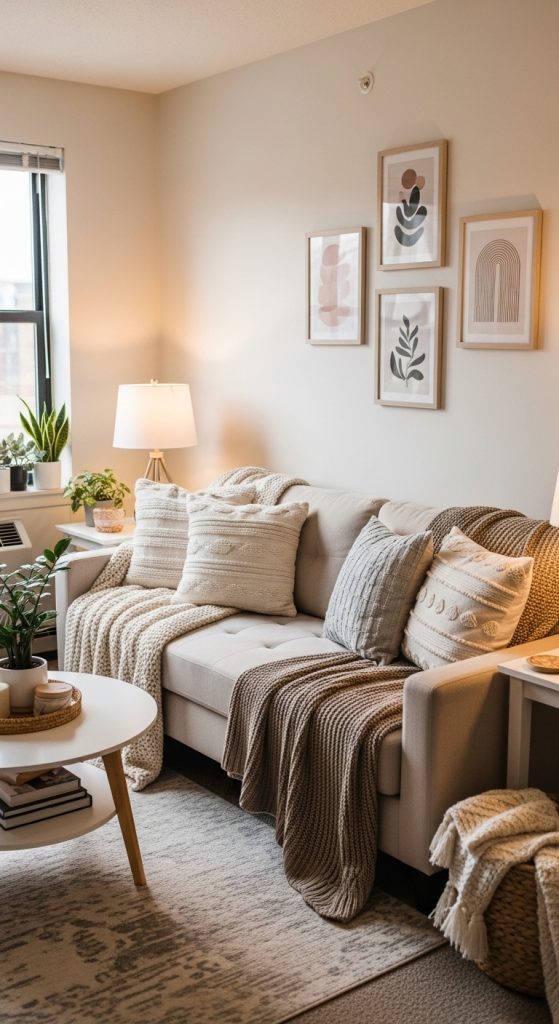 A neutral color palette instantly makes a small dorm living room feel calm and spacious. Choose beige, white, soft gray, or warm taupe for your main elements like rugs, throws, and cushions. Layering textures such as knitted blankets, faux fur pillows, and woven rugs adds warmth without overwhelming the space.