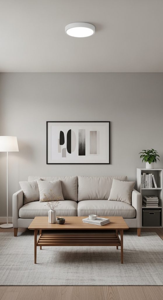 Use a compact loveseat or futon in a neutral shade and pair it with a simple coffee table. Add warm lighting with table lamps or soft LED lights to create a relaxing atmosphere perfect for movie nights or quiet evenings.
