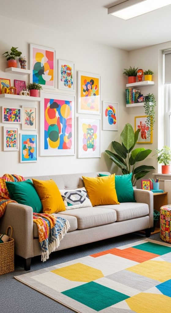 Stick to a cohesive color theme so the wall looks intentional rather than cluttered. Peel-and-stick hooks or removable wall strips are perfect for dorms where you can’t drill holes. A gallery wall adds personality and makes the space feel like home.
