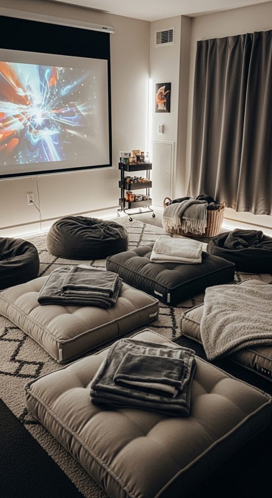 Turn your dorm living room into a cozy movie lounge. Arrange seating around a TV or projector screen. Add oversized cushions, bean bags, and soft blankets for ultimate comfort.
