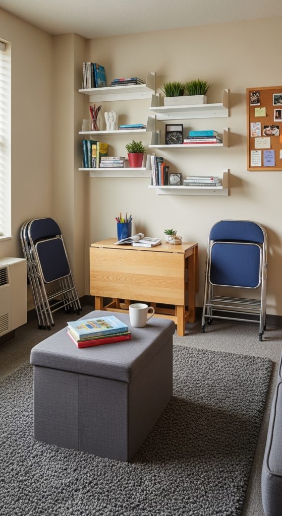 Wall-mounted shelves save floor space, while nesting tables can be tucked away when not in use. Foldable chairs are also a great option for hosting extra friends without overcrowding the room.