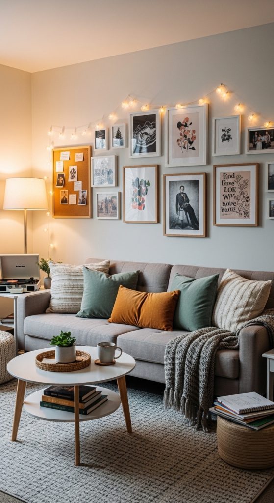 Personalize your dorm living room with a stylish gallery wall. Combine framed photos, art prints, inspirational quotes, and small mirrors to create visual interest.