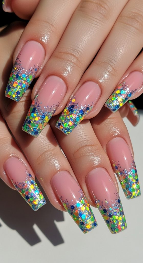 For a playful and eye-catching look, try blending pink into multicolor glitter. This design combines pink with glitter that includes shades like silver, gold, and holographic sparkles.