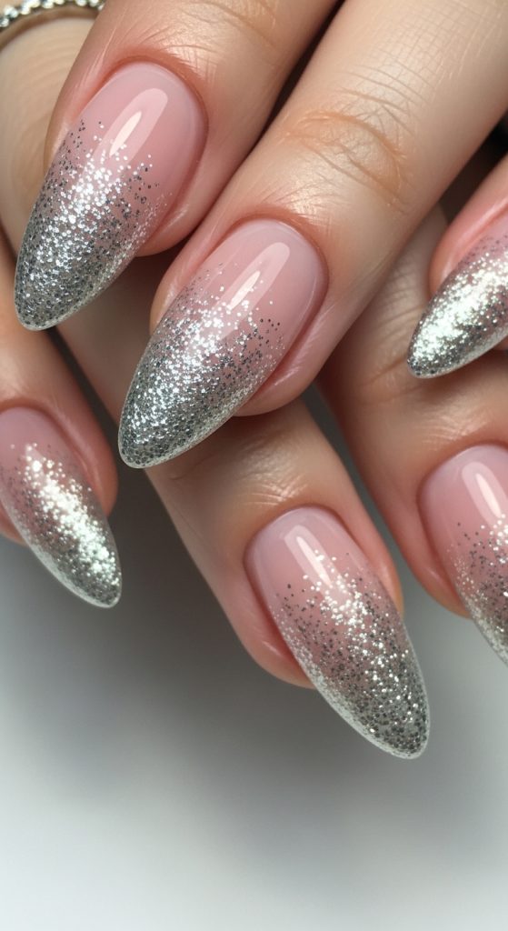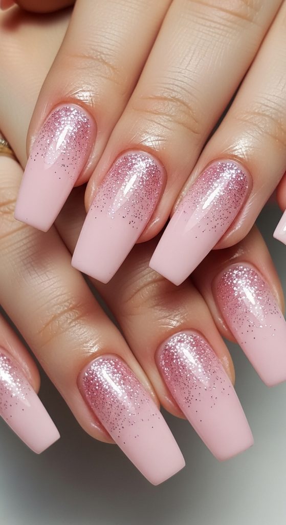 Instead of placing glitter at the tips, reverse ombre starts with glitter at the cuticle and fades into soft pink toward the tips. This modern twist on the classic ombre style feels fresh and creative.