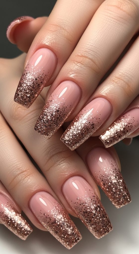 Blush pink combined with rose gold glitter creates a warm, luxurious look. This combination feels romantic and trendy at the same time. The rose gold glitter gives a rich glow that complements the softness of blush pink beautifully.