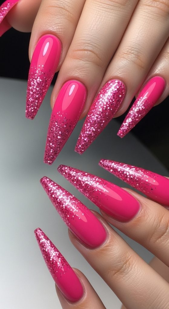 For those who love bold and dramatic nails, hot pink fading into chunky pink glitter is a stunning choice. The vibrant hot pink base creates a strong, confident foundation, while the chunky glitter adds texture and shine.