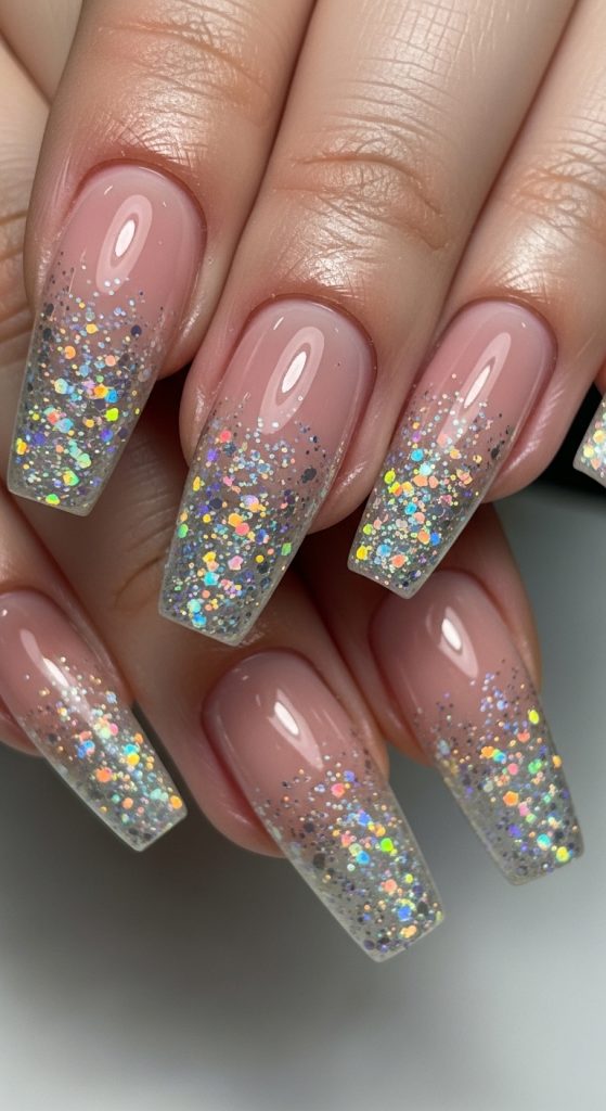 A nude pink base blending into holographic glitter creates a modern and futuristic look. The holographic glitter reflects multiple colors depending on the light, adding depth and visual interest.