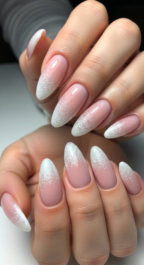 This dreamy combination starts with light pink near the cuticle and transitions into soft white glitter. The result is an ethereal, fairy-like effect that feels light and graceful.
