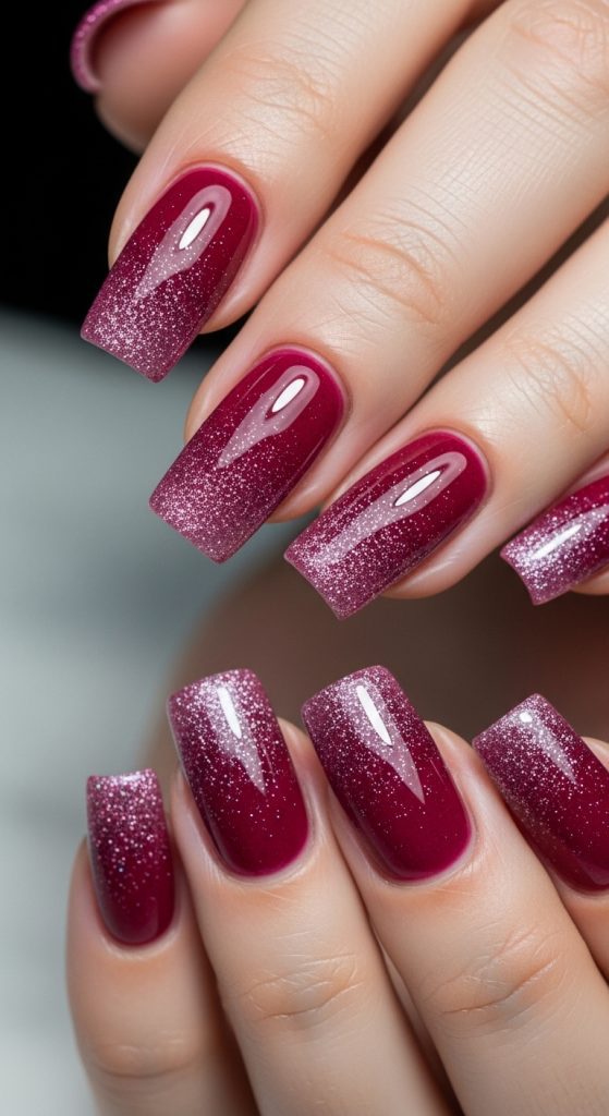 A darker pink base fading into fine glitter creates a sophisticated and mature look. This design is perfect for those who prefer deeper tones while still enjoying the sparkle of glitter.