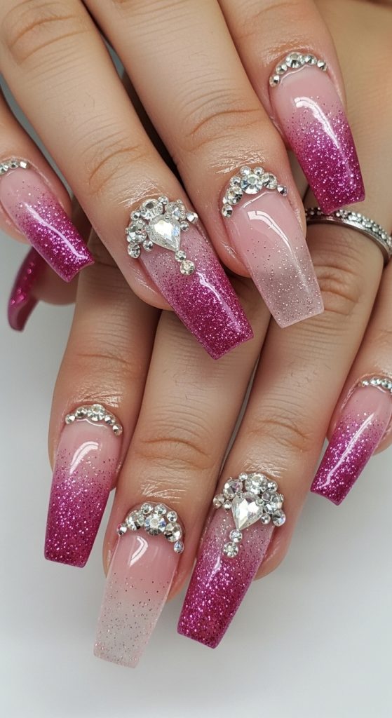 Adding rhinestones to pink glitter ombre acrylic nails takes the design to the next level. The ombre effect provides a beautiful base, while strategically placed rhinestones add extra glamour.